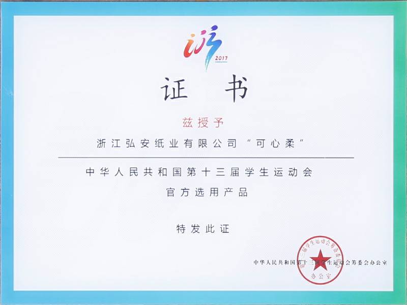 2017年9月4日中华人民共和国第十三届学生运动会在浙江杭州举行,可心柔携手中国邮政、中国平安、娃哈哈、京东校园、吉利汽车等知名企业品牌亮相大会。作为本次大会的12家合作单位之一,浙江mksports-mk(中国)一站式体育服务官方网站纸业有限公司参加了发布会,并接受了官方选用产品的授牌。